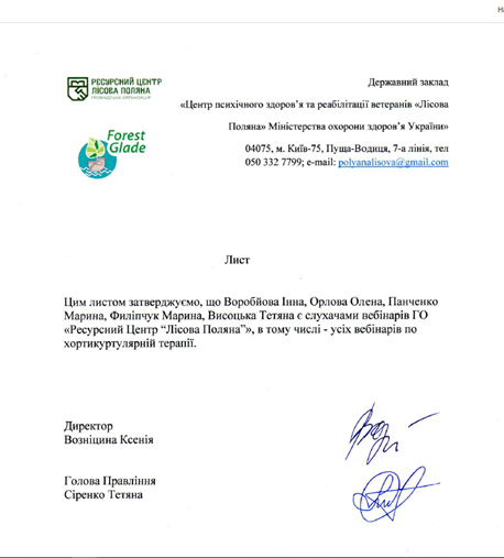 1. Лист підтримки директора Державного закладу "Центр психічного здоров'я та реабілітації ветеранів "Лісова поляна" Міністерства охорони здоров'я України Возніциної К.Б.