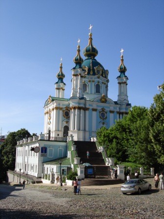 Та повернемося до самої Андріївської церкви. У наш час це - значний пам'ятник архітектури. Закладена вона була в 1744 році у зв'язку із приїздом до Києва імператриці Єлизавети Петрівни. Побудована вона в 1749-1753 роках в стилі бароко за проектом архітектора В.В. Растрелі. Будівництвом керував знавець своєї справи І.Ф. Мічурін. Висота церкви - 60 метрів (без стилобата - 46 метрів), довжина 32 метри, ширина 23 метри. Однокупольний храм із п'ятиголовим завершенням створено у вигляді хреста, в кутах якого розмістилися декоративні башти на масивних стовпах, які грають роль контрфорсів. Зовні контрфорси прикрашені пілястрами і прикриті трьома парами колон із капітоліями корінфського ордера. Вся будівля церкви спирається на двоповерхове приміщення - стилобат із вісьмома кімнатами на кожному поверсі, стіни якого являють собою фундаменти церкви. Навкруги церкви - тераса; з неї відкривається мальовнича панорама Подолу та Дніпра. В середині Андріївську церкву прикрашено ближче до стилю рококо. Це виконано з форм українських різьбярів М. Чвитки, Я. Шевлицького, московських майстрів Івана і Василя Зиміних, П. Ржевського та інших.