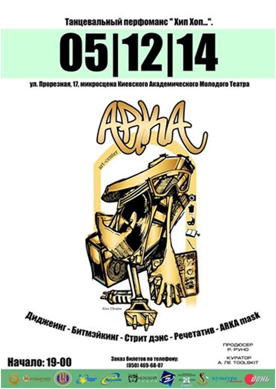 27.12.14 – відкриття «Новорічного салона галерея «Arka» та друзі», перфоманс «Хип хоп – это …» та виставка «Arka» mask, м. Київ, вул. Прорізна, 17, мікросцена, вхід по квитках