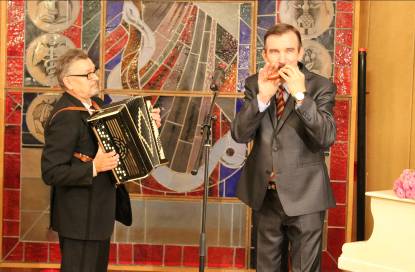 Незабутнім подарунком і для художника, і для глядачів став виступ його творчого побратима, прекрасного музиканта Михайла ТВЕРДОГО, митця, що у найширших колах шанувальників музики здобув ім’я «людини-оркестру» за віртуозність виконання, майстерну гру на багатьох інструментах. Під акомпанемент баяна чи фортепіано у руках у майстра опинялися то сопілка, то флейта, то окарина, кувала зозуля, щебетав соловейко.