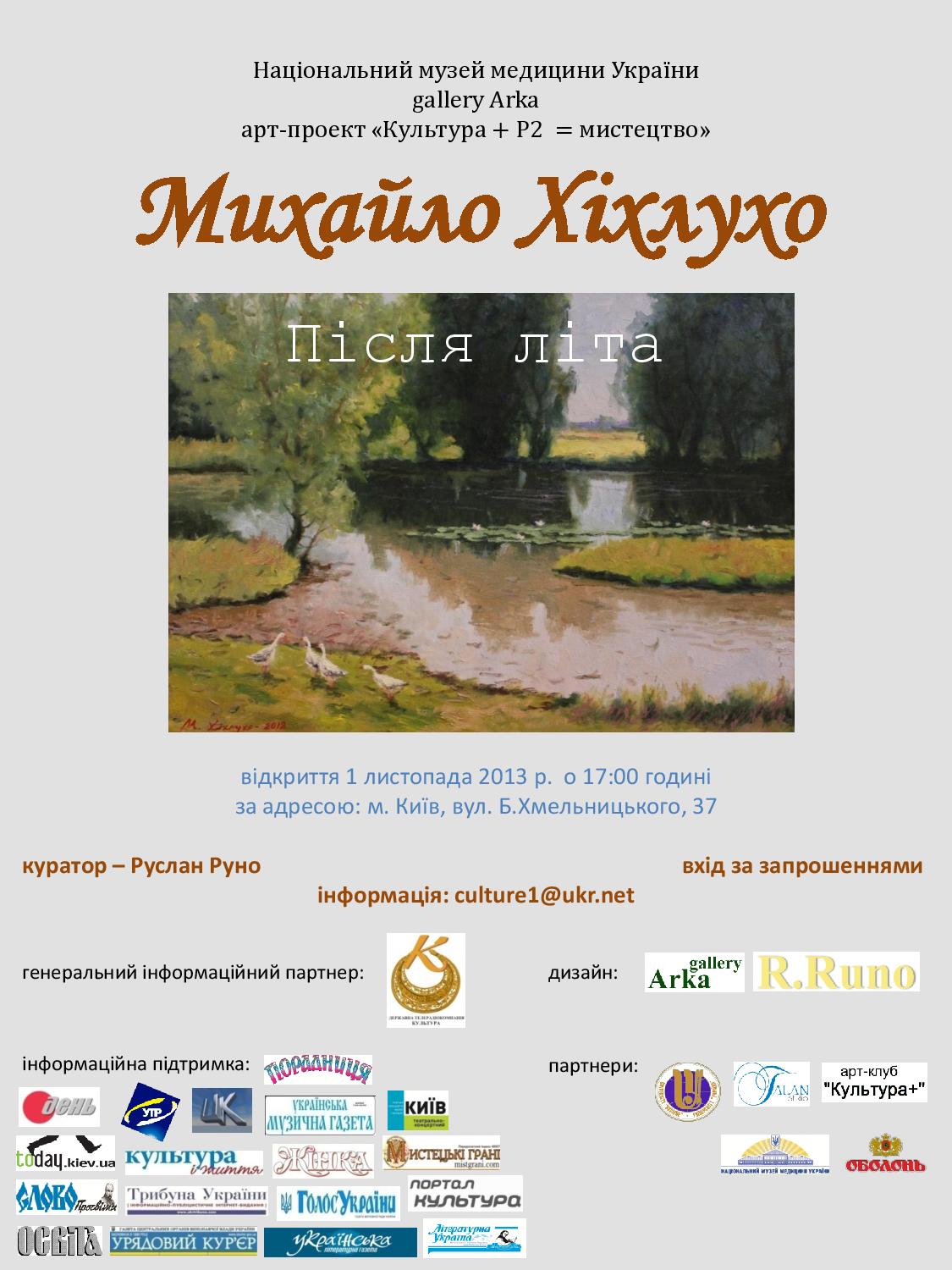 На афіші – літо уповні. Зеленіють тополі над ставом. По зеленому моріжку повагом сунуть качки. Це – картина Михайла ХІХЛУХА з його виставки «Після літа», відкритої 1 листопада в арт-галереї «Арка». Так, галерея «Арка» знову гостинно відкриває двері і представляє свої скарби. На цей раз вона розгорнула чудові краєвиди Чернігівщини Михайла Хіхлуха, уродженця села Андріївки на Городнянщині, співця чернігівських далей. Про картини Михайла Володимировича можна говорити багато, але слід їх побачити на власні очі.