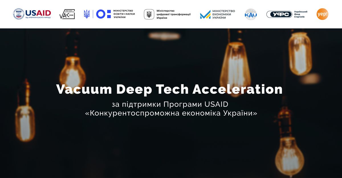The acceleration programs Science Intensive Innovation and Development and Renovation are implemented by Vacuum Deep Tech Acceleration with the support of the USAID Competitive Economy Program in Ukraine, the Ministry of Education and Science of Ukraine, the Ministry of Digital Transformation of Ukraine, and the Ministry of Economy of Ukraine in cooperation with the Kyiv Academic University, Ukrainian Startup Fund, and YEP Accelerator.