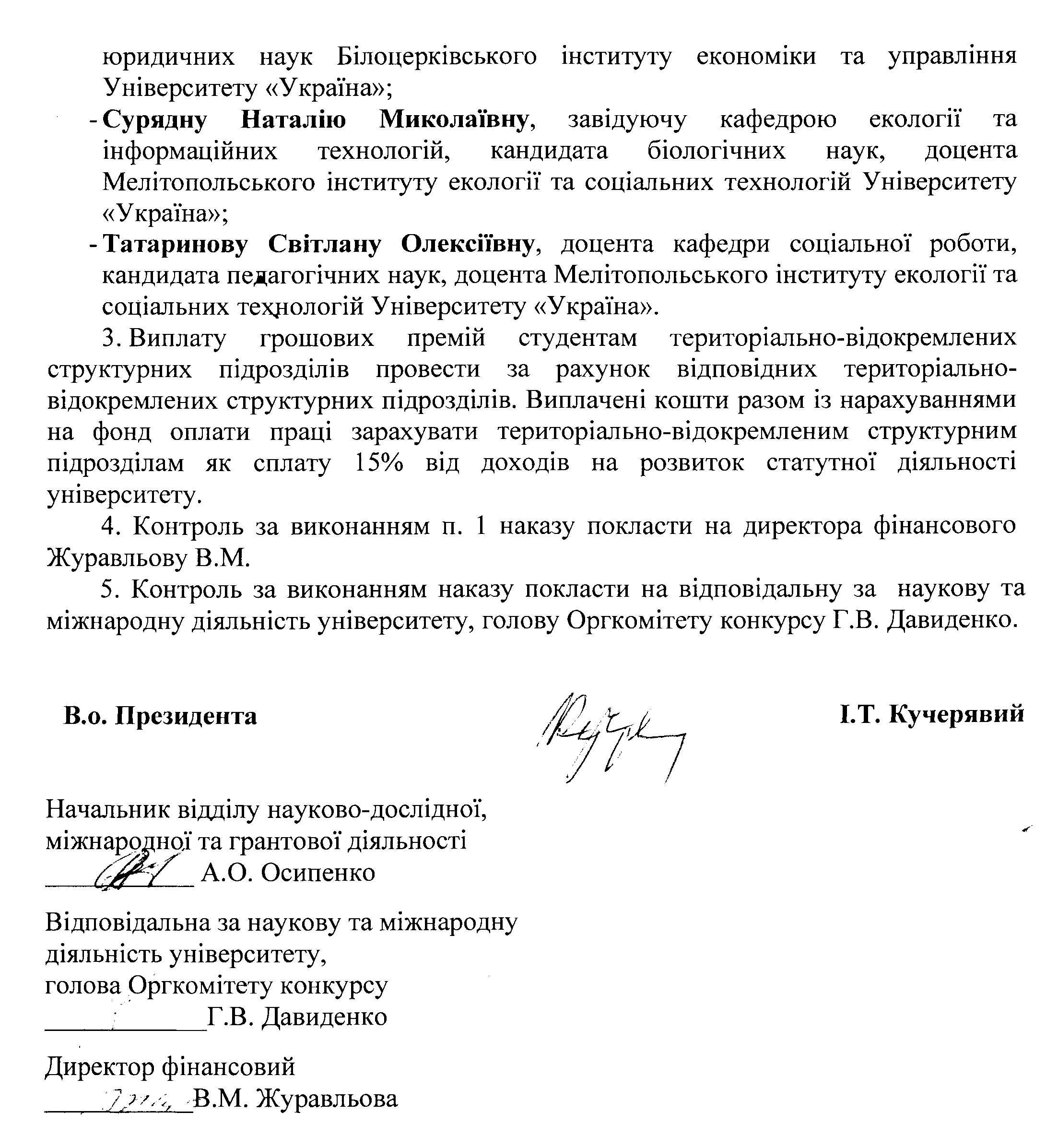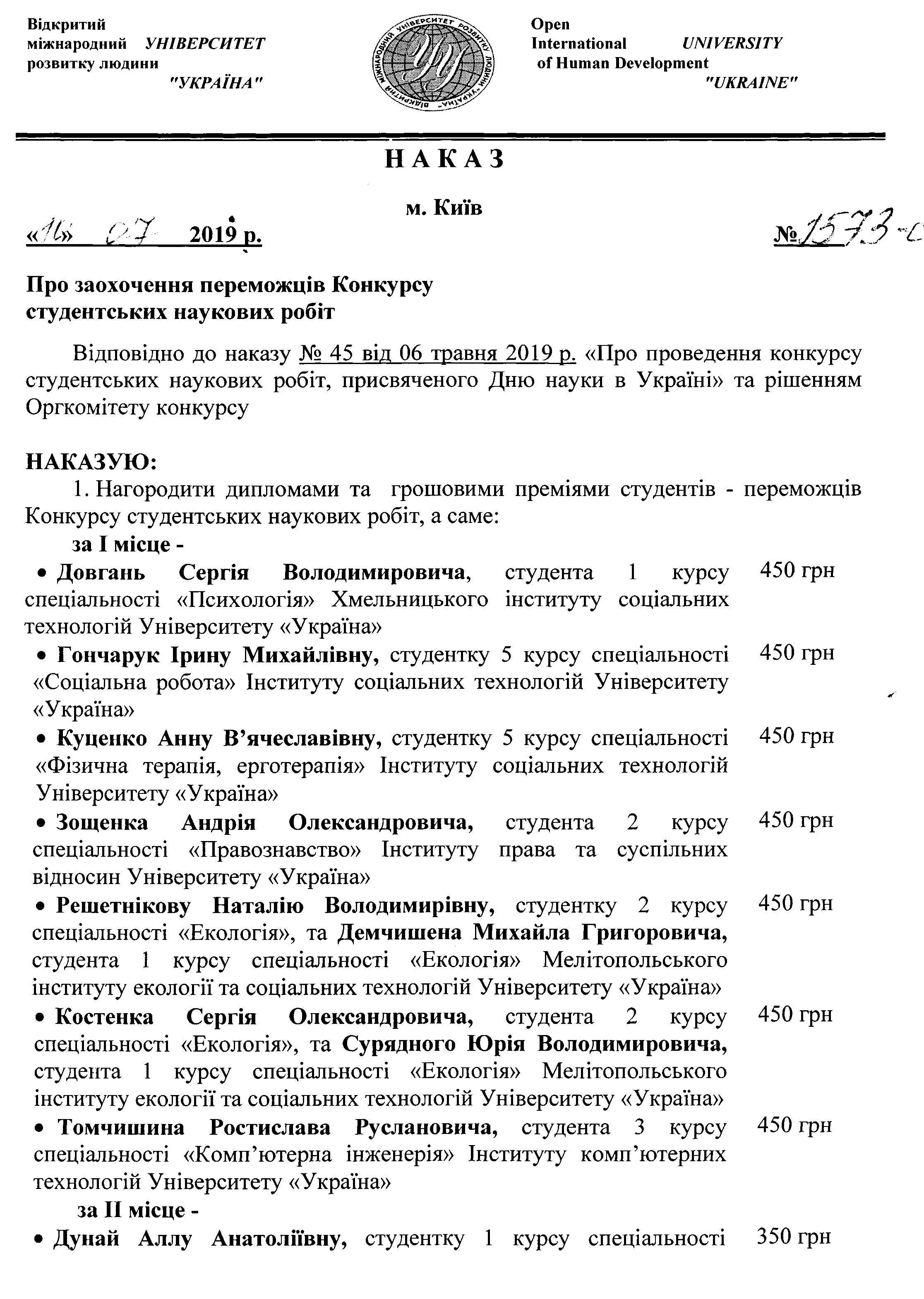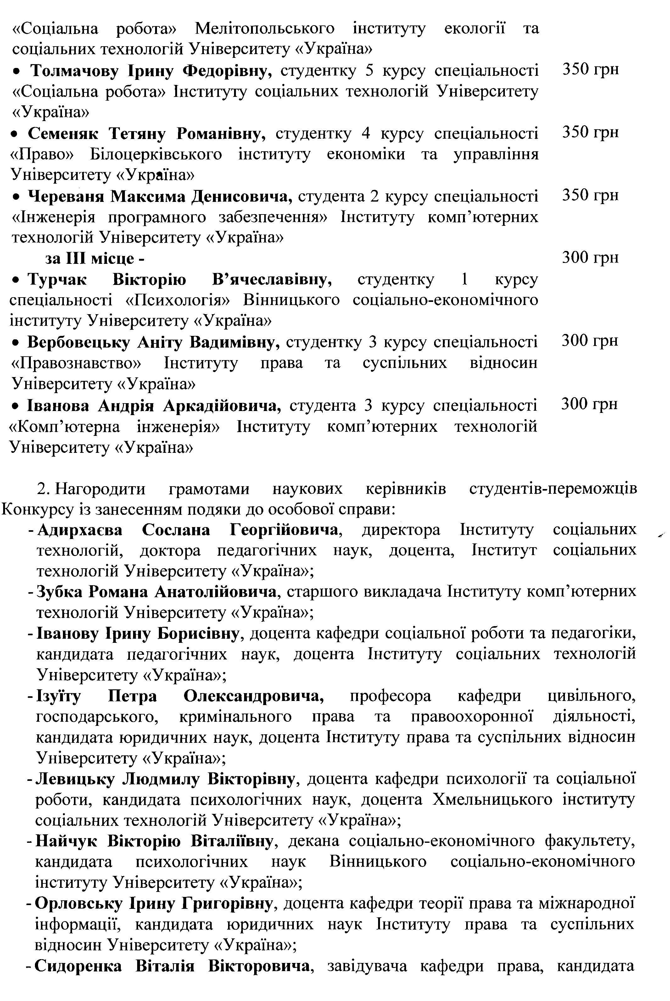 - Гришаєву Анастасію Сергіївну, студентку 4 курсу спеціальності «Право» Хмельницького інституту соціальних технологій Університету «Україна», за наукову роботу «Правові особливості застосування відповідальності за зловживання монопольним становищем у господарській діяльності». Науковий керівник: Якименко А.А., викладач. - Осипенка Андрія Ігоровича, студента 4 курсу спеціальності «Право» Білоцерківського інституту економіки та управління Університету «Україна», за наукову роботу «Походження держави: історичне підґрунтя та теоретичне обґрунтування». Науковий керівник: Сидоренко В.В., завідувач кафедри права, кандидат юридичних наук. - Коломійця Анатолія Миколайовича, студента 4 курсу спеціальності «Менеджмент» Вінницького соціально-економічного інституту Університету «Україна», за наукову роботу «Оцінка ефективності управлінської діяльності на підприємстві». Науковий керівник: Євась Т.В., старший викладач кафедри економіки та менеджменту. - Фаліну Дар’ю Сергіївну, студентку 3 курсу спеціальності «Маркетинг» Миколаївського міжрегіонального інституту розвитку людини Університету «Україна», за наукову роботу «Розробка іміджевої реклами підприємства меблевої промисловості». Наукові керівники: Сидорець Л.В., старший викладач кафедри підприємництва, управління та адміністрування; Ляшенко В.В., доцент кафедри управління та адміністрування. - Душенко Юлію Сергіївну, студентку 1 курсу магістратури спеціальності «Менеджмент» Миколаївського міжрегіонального інституту розвитку людини Університету «Україна», за наукову роботу «Вдосконалення управління витратами підприємств». Науковий керівник: Домбровська Л.В., декан факультету економіки та інформаційних технологій, кандидат економічних наук, доцент. - Поліху Вікторію Володимирівну, студентку 3 курсу спеціальності «Фінанси, банківська справа і страхування» Дубенської філії Університету «Україна», за наукову роботу «Перспективи входження України у Топ-20». Науковий керівник: Васюк І.В., старший викладач, кандидат економічних наук.